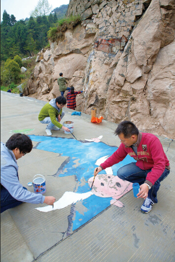 温州网讯 近日,在温州市区大罗山盘垟村入口处,十多名银河 美术学院的师生,在水泥路、岩石上进行手绘创作——蓝色的天空、憨态的智慧猪,生动有趣。 相关链接://news.66wz.com/system/2015/04/20/104422135.shtml