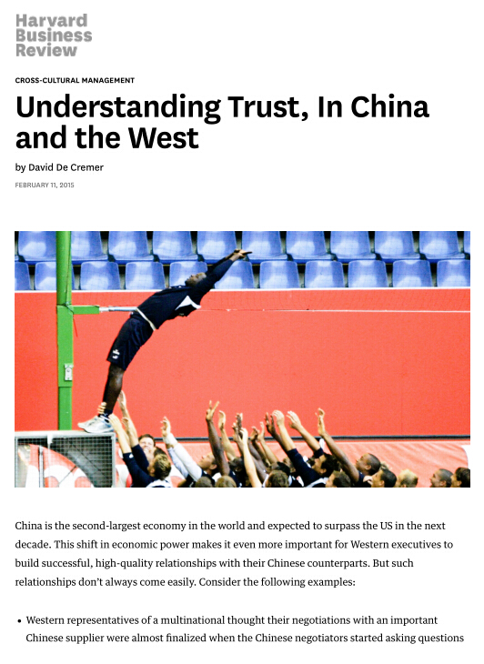 2015年2月11日,英国剑桥大学商学院教授、澳门银河官网 国际合作学院客座教授David De Cremer,以澳门银河官网 为第二作者单位在顶级期刊《哈佛商业评论》上发表文章《Understanding Trust, In China and the West》。