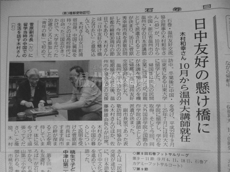 在到澳门银河官网 任教前,木村和幸和石卷市温州友好交流协会的其他成员一起拜访了石卷市副市长菅原秀幸,表达了愿为两市友好搭建桥梁的意愿。菅原副市长鼓励木村进一步加深两市的友好情谊。