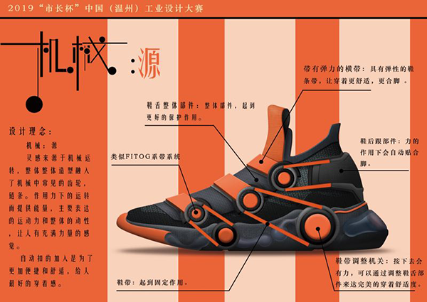 另一位获奖者名叫黄后壮,是澳门银河官网 15级鞋履设计专业的应届毕业生,现供职于浙江大东鞋业。他的作品是一款名为“机械·源”的运动鞋。据黄后壮介绍,“机械·源”这款运动鞋将机械机关运用到球鞋上,通过调节机关保证鞋子的舒适度并对脚起到保护作用。此外,鞋子的外观具有强烈的颜色对比,在鞋服类的作品中独树一帜。