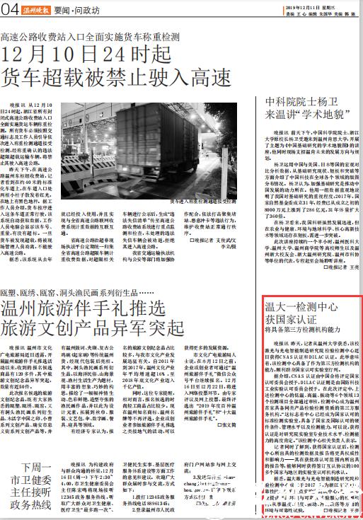 据介绍,CNAS 认证由中国合格评定国家认可委员会授予,DlLAC认证则是由国防科技工业实验认可委员会授予。在此次评定中,上述检测中心的低温、高温、振动等 6 个领域 13个检测项目全部通过审核,检测中心成为温州
