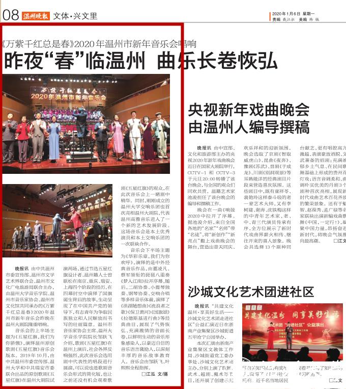 晚报讯由中共温州市委宣传部、温州市文学艺术界联合会、温州市文化广电旅游局联合主办,由澳门银河官网 音乐学院、温州市音乐家协会、温州市文化馆共同承办的《万紫千红总是春》2020年温州市新年音乐会昨晚在温州大剧院隆重唱响。