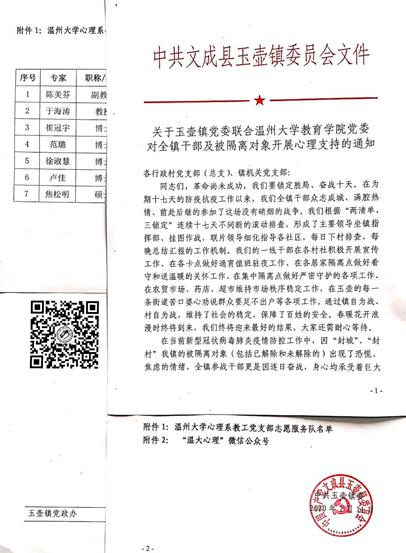 在教育学院党委的大力支持下,澳门银河官网 心理系教工党支部志愿服务队即刻对口支援文成县玉壶镇的疫情防控工作。心理系教工党支部书记陈美芬副教授等7位专家组成的专业团队,通过主动介入、心理支持热线和网络辅导等方式,面向玉壶镇全体干部及被隔离对象开展服务工作。