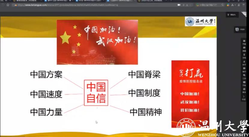 2月24日全校开学第一节课,校党委书记谢树华早早登陆国内知名学习平台“课堂派”,全程在线观摩由谢建芬老师主讲的《毛泽东思想和中国特色社会主义理论体系概论》课程。线上教学中,谢建芬老师将中国特色社会主义原理与当前国家“疫情”处置的举措联系起来,与财务专业学生未来职业发展联系起来,在课堂中贴切自然、“如盐入味”地进行价值塑造,将立德树人贯彻到课堂教学的全过程、全方位、全员之中。谢书记对谢建芬老师线上教学能力与新型互动方式予以高度认同。校党委副书记庄兴忠开学第三节课登录“课堂派”,全程在线观摩了陈金飞老师主讲的“中国近现代史纲要”课程。陈金飞老师准备QQ群、课堂派和腾讯会议多个教学平台,上传抗“疫”专题课件,面对开学第一课可能出现的网络问题做了充分预案并自如的做好及时切换,实现了“抗疫思政第一课”高质量完成。