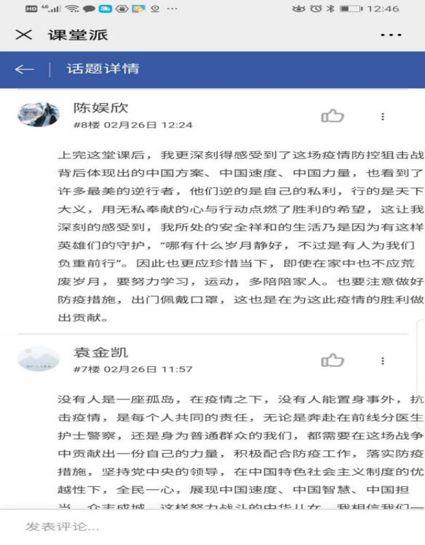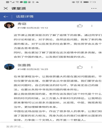 在《概论》课教学平台讨论区,同学们积极留言“抗疫思政第一课”的感想,表达了战胜疫情的必胜信念和中国制度的力量与优越性。刘何宁同学留言说:“开学第一课,我深有感触。谁也想不到,2020的中国土地上,会肆虐着新型冠状病毒。这场病毒带来的迫害无疑是巨大的,经济损失、人员伤亡...... 八十四岁的钟南山先生、奋战在一线的医护人员、默默捐赠物资的平凡天使...... ”。
