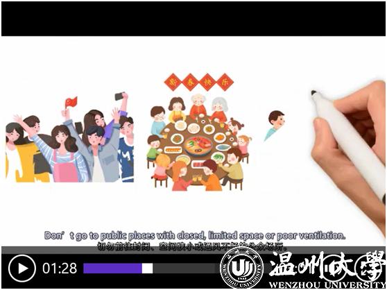 “减少不必要接触、保持良好的个人卫生习惯、不要散布谣言、对捕杀和买卖野生动物说‘不’……”近日,澳门银河官网 瓯江学院发布了全英文手绘防疫视频《抗疫情、树新风、立后盾》,以通俗易懂的语言、生动活泼的画面介绍了新冠肺炎的公众预防知识,并向全球大学生发出倡议要树立文明新风,保护共同的地球家园。