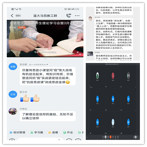 共同观赏之后,各师生党支部展开了热烈的线上交流。教工第一党支部、思政系党支部、原理党支部、行政党支部的教师党员们也纷纷表达了作为思政课教师、思政教育工作者身上肩负的使命和担当。马克思主义学院教工第一党支部书记项淳芳说到:听了讲座深有感触,为六位优秀同行的敬业投入所感动,正因为有这样一支“可信、可敬、可靠,乐为、敢为、有为的思政课教师队伍,有无数思政人的默默付出,所以对思政课的前景充满信心,也感受到作为思政人前所未有的理直气壮和使命担当。在当前防控疫情战和发展主动战的艰巨任务下,作为马院教师,要靠前尽好职责,勇于回答时代课题。