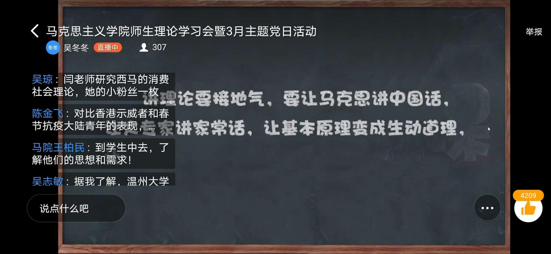 本次主题党日活动,4个教工党支部和4个学生党支部,近200名师生党员、入党积极分子参加,直播学习获得了4200多个点赞,取得了良好的效果,是互联网+党建、党员教育管理线上活动的有力探索。