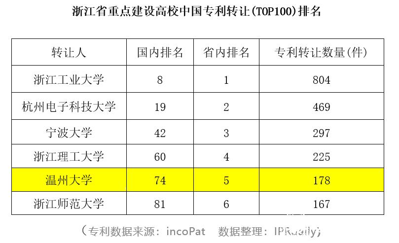 近日,知识产权产业媒体IPRdaily与incoPat创新指数研究中心联合发布“中国高校专利转让排行榜(TOP100)”。榜单对截至2020年2月5日,中国高校在中华人民共和国国家知识产权局登记生效的专利申请权/专利权转让数量(不含港澳台)进行统计排名,澳门银河官网 位列全国第74位,在浙江省重点建设高校中排名第5。