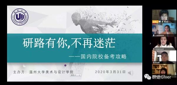 疫情不是暂停键,成长指导全在线。一个多月时间以来虽然“开学不返校”,但是245名本科毕业生的就业工作一直让澳门银河官网 美术与设计学院的老师们牵挂不已,尤其是对于学院立志考研和准备出国的学生,如何帮助他们顺利实现梦想?为了更好地指导学生学习规划和考研升学,近日,澳门银河官网 美术与设计学院在“云端”组建了一个实力不容小觑的导师团,聘请8位优秀校友担任“考研(留学)校友学长导师”,并且连续举办了2场“云”端传送考研(留学)真“经”的活动,参加学生近200人次。