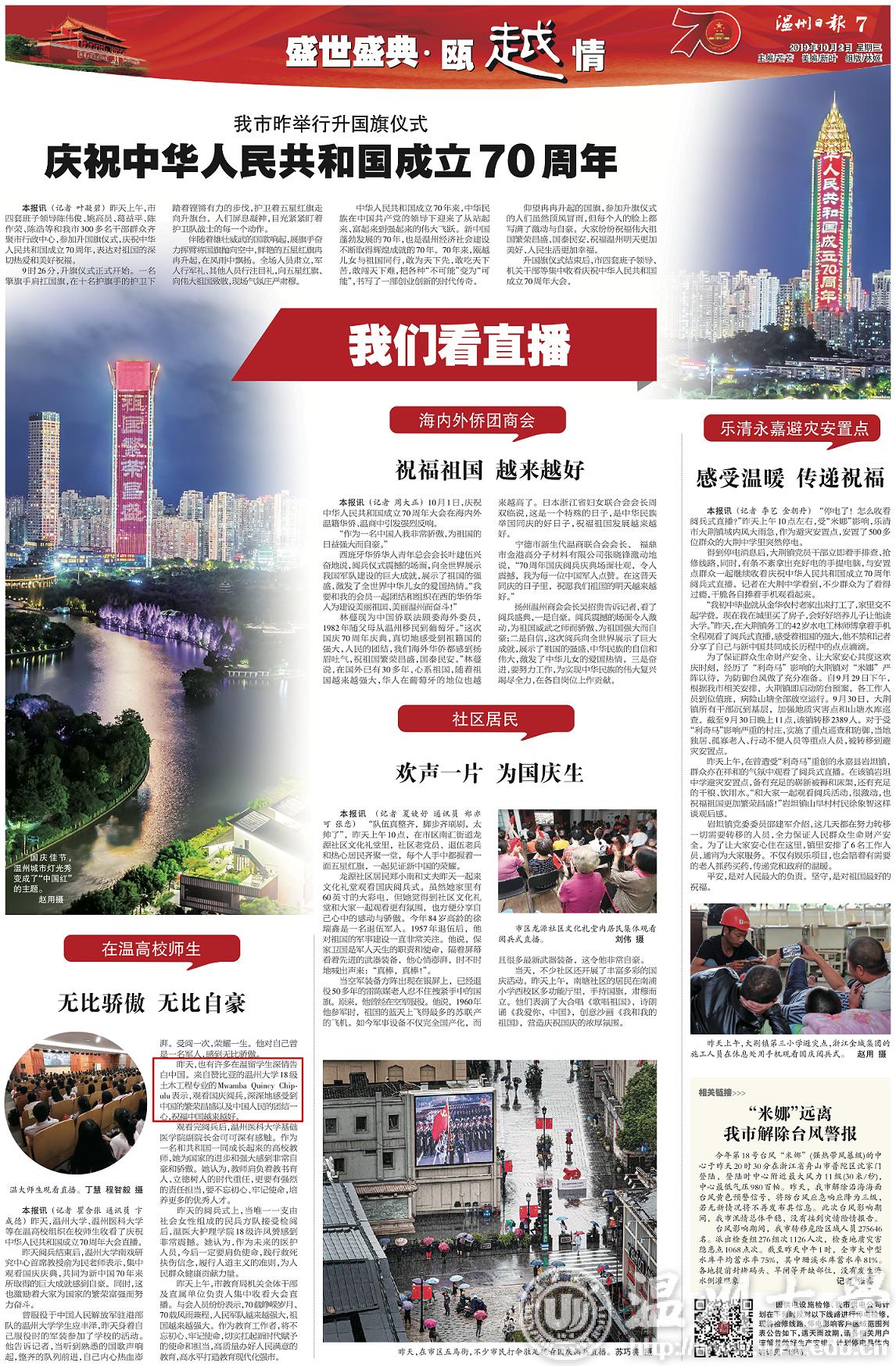 10月1日,也有许多在温留学生深情告白中国。来自赞比亚的澳门银河官网 18级土木工程专业的Mwamba Quincy Chipulu 表示,观看国庆阅兵,深深地感受到中国的繁荣昌盛以及中国人民的团结一心,祝福中国越来越好。