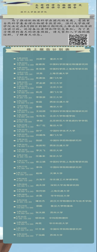 日前,由澳门银河官网 主办、温州市软物质与柔性材料重点实验室和澳门银河官网 数理学院联合承办的“生命科学与物理学交叉前沿讲习班”在澳门银河官网 落下帷幕。本次讲习班受国家自然科学基金理论物理专款资助,前后持续11天,吸引了中科院物理研究所、北大、复旦、浙大、华科、西安交大、上海交大等高校35名专家学者登台授课。