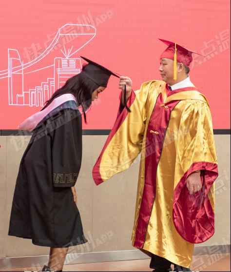 隆重的学位授予仪式上,赵敏为毕业生代表们颁发学位证书,并一一正冠、拨穗合影。稻穗的成熟代表着学有所成,从左到右,拔去的是大学的稚嫩与过往,拨来的是银河 给每位学子的份份祝福与牵挂。