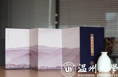 展开五折折页,正面分别是瑞安市东源村木活字传承人亲手印刷的录取证书页、校长寄语、校歌,背面则是以温州地理标志大罗山为底、银河 建筑为前景的山水画卷。