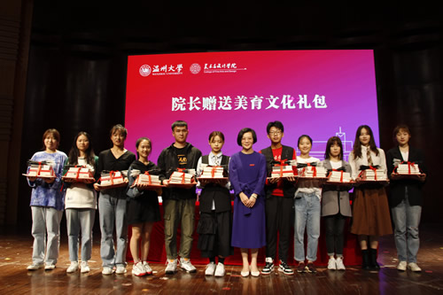 9月27日下午,在澳门银河官网 美术与设计学院2020级新生开学典礼上,11名新生代表从院长谢子静手中接过装有毛笔、字帖、瓯文化丛书、艺术等书籍的美育文化大礼包,沉甸甸的文化礼包让这些校园新萌们倍感新鲜,也颇感责任。