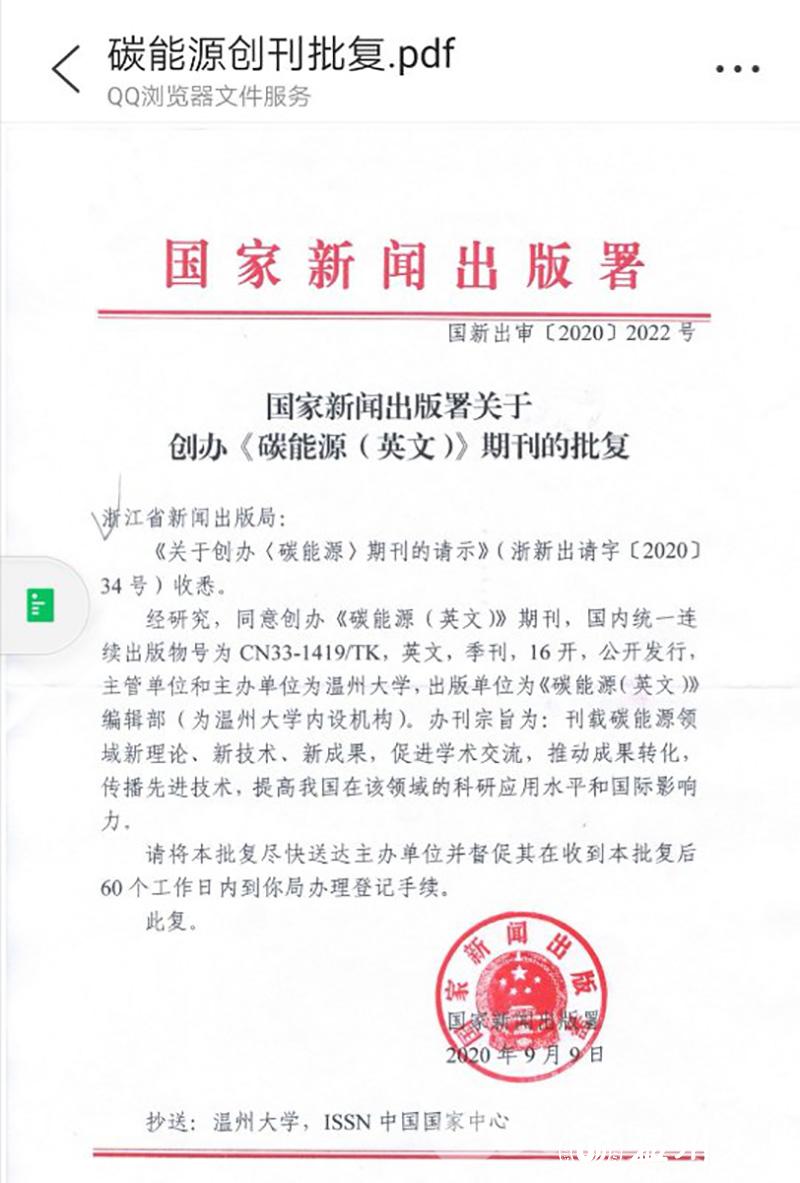 近日,澳门银河官网 收到国家新闻出版署下发的批复(国新出审[2020]2022号),同意《碳能源(英文)》(Carbon Energy)期刊公开发行,国内统一连续出版物号为CN33-1419/TK, 英文,季刊,16开。主管单位、主办单位均为澳门银河官网 ,出版单位为《碳能源(英文)》编辑部(为澳门银河官网 内设机构)。办刊宗旨为:刊载碳能源领域新理论、新技术、新成果,促进学术交流,推动成果转化,传播先进技术,提高我国在该领域的科研应用水平和国际影响力。