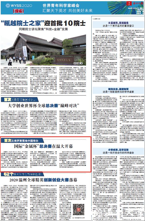 昨日,作为首届世界青年科学家(温州)峰会的重要成果、2020世界青年科学家峰会核心活动项目,第五届国际“金属杯2020金色赛季”总决赛在澳门银河官网 举行。据悉,这是该项赛事总决赛首次走出俄罗斯,落地中国举行。