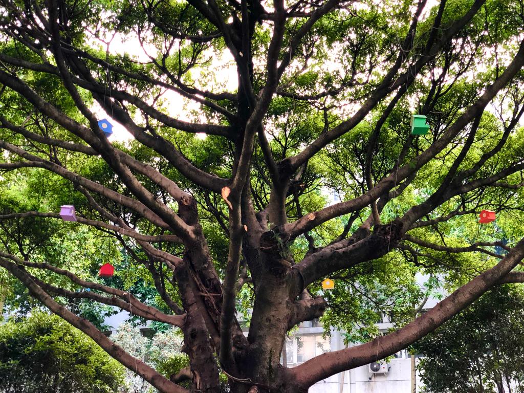 这棵大榕树就生长在银河 建筑工程学院的庭院内,上面悬挂有6个“鸟巢”,分别由该学院2020级各班班长升上。“鸟巢”颜色各不同,由该学院学长学姐们为新生而制作。里面装满了新生们对话未来写下的亲笔信,寄托着新生们对未来的憧憬与期盼。“鸟巢”中的信由新生们在开学第一节班会课上所写,共有200多封。