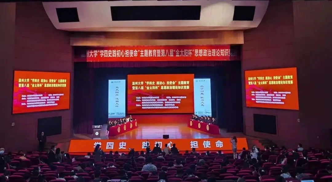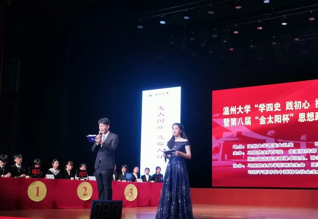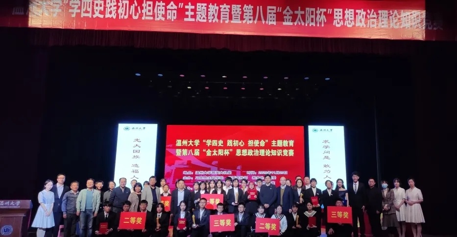 值此之际,为深入学习贯彻习近平新时代中国特色社会主义思想,特别是习近平总书记关于党史、新中国史、改革开放史、社会主义发展史的重要论述,检验大学生对“四史”知识掌握程度, 11月25日,澳门银河官网 “学四史 践初心 担使命”主题教育暨第八届“金太阳杯”思想政治理论知识竞赛在澳门银河官网 育英大礼堂隆重举行。本次竞赛活动由澳门银河官网 马克思主义学院,党委宣传部,教务处,团委,浙江省高校思政课卓高生、孙邦金名师工作室联合主办,由马克主义学院研究生会、习近平新时代中国特色社会主义思想读书会协办。澳门银河官网 党委副书记庄兴忠,党委委员、宣传部部长潘玉驹,校纪委副书记、纪检监察室主任杨立淮,教务处处长孙芙蓉,团委书记易招娣,马克思主义学院党委书记王柏民,院长卓高生,副院长孙邦金,副书记叶柏霜等领导亲临现场指导,并为获奖队伍颁奖。