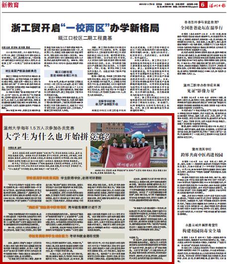 “参加竞赛带给我们的不光是荣誉,我和团队也收获了很多系统实践应用方面的经验知识,看到了我们的不足。”获得浙江省第十二届“挑战杯”大学生创业计划竞赛特等奖的温职院学生钱煊博谈起竞赛时说。