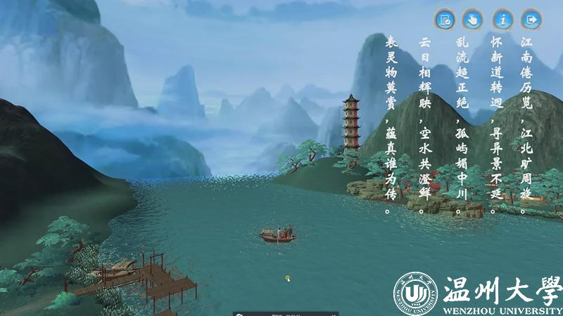 今年11月,《山水诗之意境体验虚拟仿真实验教学项目》被正式认定为国家级虚拟仿真实验教学一流课程,是全国首批文学类的虚拟仿真实验教学项目,也是浙江省唯一的文学类虚拟仿真实验教学课程。2017年9月,该项目正式在银河 人文学院上线试课,创新教学模式,深受学生欢迎。温州作为山水诗发源地,研发团队将此作为教学项目主题,学生可选取山水诗鼻祖谢灵运、山水诗代表诗人孟浩然、文天祥等文人作为虚拟仿真实验中的特定角色,以江心屿作为特色地标。在技术渲染的手段下,学生可以在充满意境的虚拟仿真环境中沉浸式地学习古典诗词,真正达到在自主学习过程中掌握系统化知识的目的。