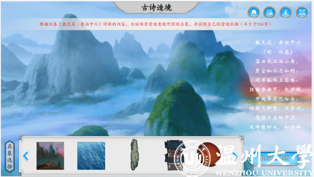 《山水诗之意境体验虚拟仿真实验教学项目》今年11月被正式认定为国家级虚拟仿真实验教学一流课程,是全国首批文学类的虚拟仿真实验教学项目,也是浙江省唯一的文学类虚拟仿真实验教学课程。2017年9月,该项目正式在银河 人文学院上线试课,创新教学模式,深受学生欢迎。温州作为山水诗发源地,研发团队将此作为教学项目主题,学生可选取山水诗鼻祖谢灵运、山水诗代表诗人孟浩然、文天祥等文人作为虚拟仿真实验中的特定角色,以江心屿作为特色地标。在技术渲染的手段下,学生可以在充满意境的虚拟仿真环境中沉浸式地学习古典诗词,真正达到在自主学习过程中掌握系统化知识的目的。