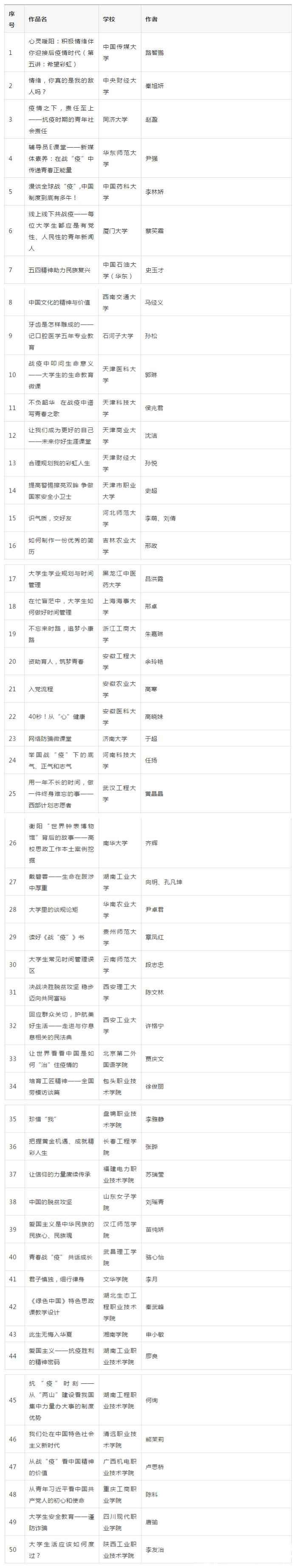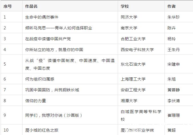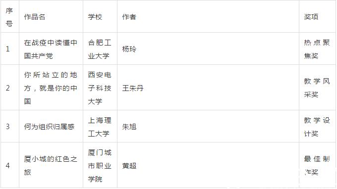 在教育部思政司精心指导和全国高校积极参与下,由高校思想政治工作队伍培训研修中心(高等教育出版社)、全国高校思想政治工作网、高校辅导员网络培训中心联合举办的2020年度全国高校思想政治工作“金微课”征集活动现已完成作品征集与专家评审,共遴选出一等奖10件、二等奖20件、三等奖30件、优秀奖50件,以及热点聚焦奖、教学设计奖、教学风采奖、最佳制作奖等单项奖各1件,现将获奖名单予以公示。