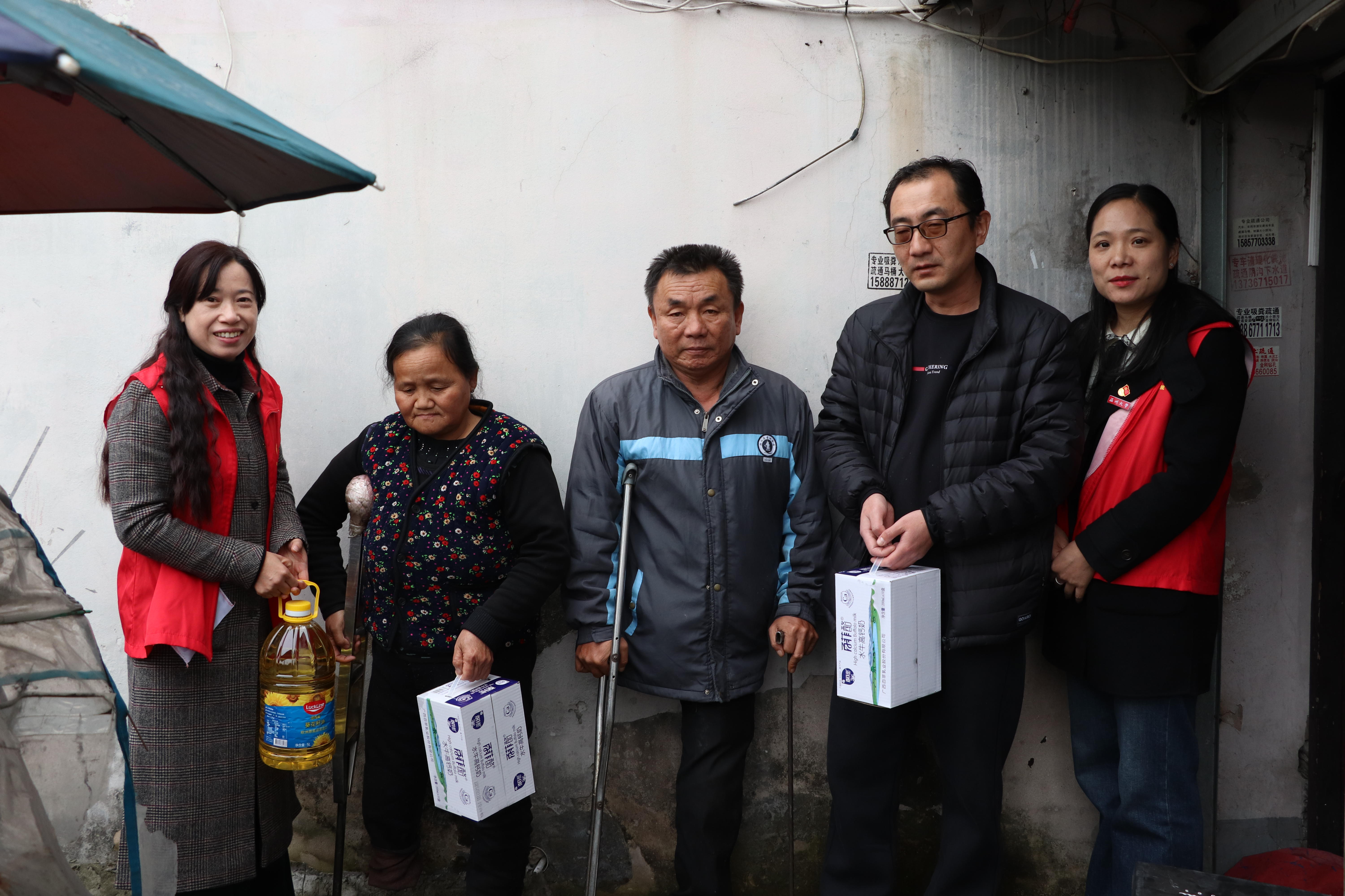 党员同志们跟随着这对残障夫妻在塘河边的家,这是一处低矮阴暗的仅十几平米的单间,家中没有柜子、冰箱、卫生间等基本设施,很难想象这对夫妻如何在这里生活。面对我们志愿者的到来,女主人非常热情邀请我们进屋,男主人曾老伯则为我们讲述他的故事。曾老伯江西人来温州二十年了,早些年在工厂打工,现在因为岁数大了则只能开电动三轮车赚些生活费。虽然艰苦,但是还是得到了温州的照顾,就连身上的很多衣服都是邻居们赠送的。他也非常感激国家,他说他们的医疗保险都是国家资助的。今天也非常感谢志愿者们来看望他们夫妻。