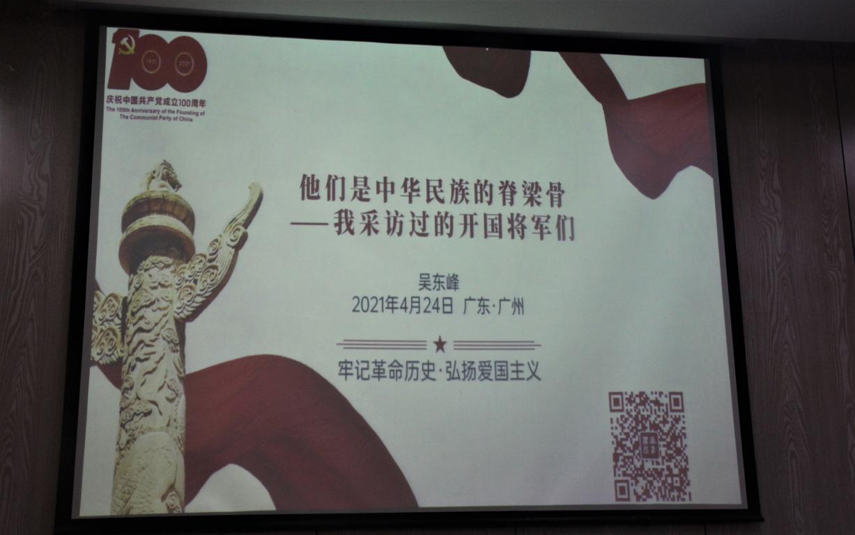 讲座上,吴东峰还以采访照片为引,讲述了自己采访张爱萍等多位开国将军时所发生的趣闻轶事。讲座末尾,吴东峰表达了对在场学生的期待和鼓励,讲座在热烈的掌声中圆满结束。“吴东峰先生创新性地从采访者的视角,以讲故事的形式生动描述了新中国的革命史和战争史,这种跳出刻板说教形式的党史教育,令人印象深刻、受益匪浅。”银河 人文学院相关负责人表示,学院历来高度重视党史学习教育,希望同学们可以通过系列党史学习教育汲取革命先辈们的精神力量,传承宝贵的精神遗产,继续砥砺前行。