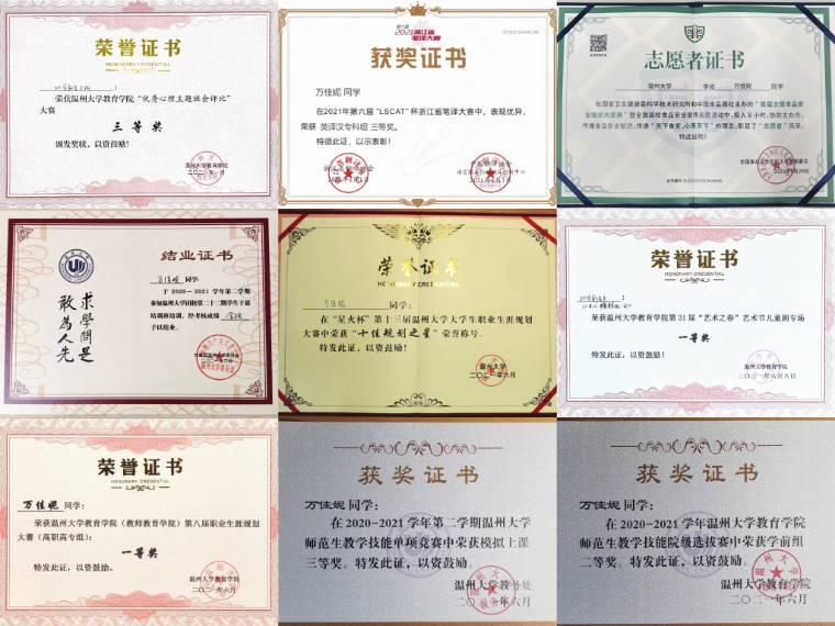 作为一名学前教育专业师范生,在学习方面,她勤奋钻研、科学施教,经常与老师探讨新的教学理论和教学方法,为未来的职业打下坚实的基础。在校期间,她荣获2021年澳门银河官网 教育学院师范生教学技能院级选拔赛三等二奖、澳门银河官网 师范生教学技能单项竞赛三等奖等。