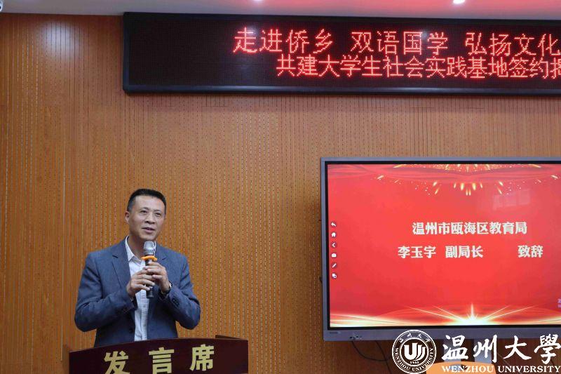 会议伊始,温州市瓯海区教育局副局长李玉宇肯定了前期双方为推进深入共建大学生社会实践基地做出的大量工作,以及本次合作的积极意义。在讲话中,李玉宇副局长对社会实践基地的成立提出了三点希望,一是要“虚功实做”,把本次共建工作做得扎实,做出特色;二是希望借此平台,大学生能够在实践中实现教学相长;三是希望澳门银河官网 外国语学院、侨联以及社会各界能够一如既往地对瓯海的教育给予关心与支持。