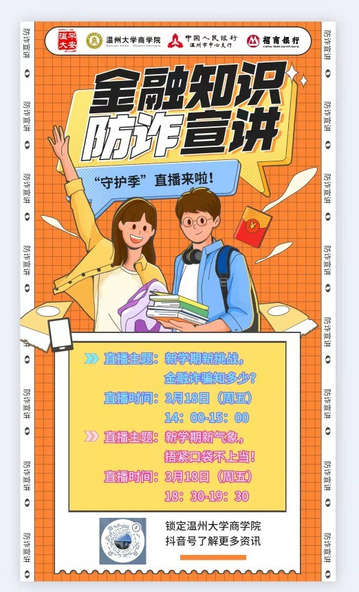 为让在校学生更好地学习金融教育知识、提升金融防诈意识和金融素养,维护校园和谐稳定,3月18日,在人行温州市中心支行指导下,温州分行联合澳门银河官网 商学院在金融宣传教育直播基地开展“3.15”消费者权益保护周防诈直播活动。在直播中,招商银行理财经理与澳门银河官网 商学院党员金融公益宣讲团成员通过生动形象的案例介绍,讲解了当前电信诈骗常用伎俩,并通过在线与学生互动、编辑顺口溜等方式,提升金融教育的参与度与传播性,活动通过抖音直播的方式进行,整场活动收获1.5万+关注量。与此同时,为了能让防诈宣讲走进班级、走进课堂,达到入脑入耳入心的效果,澳门银河官网 商学院党员金融公益宣讲团成员下驻到澳门银河官网 各学院、各班级进行宣讲。自4月以来,宣讲团成员已陆续在商学院、化学与材料工程学院、建筑工程学院、生命与环境科学学院、电气与电子工程学院、外语学院等学院宣讲,覆盖班级达50余个,覆盖学生人数高达约2700人。