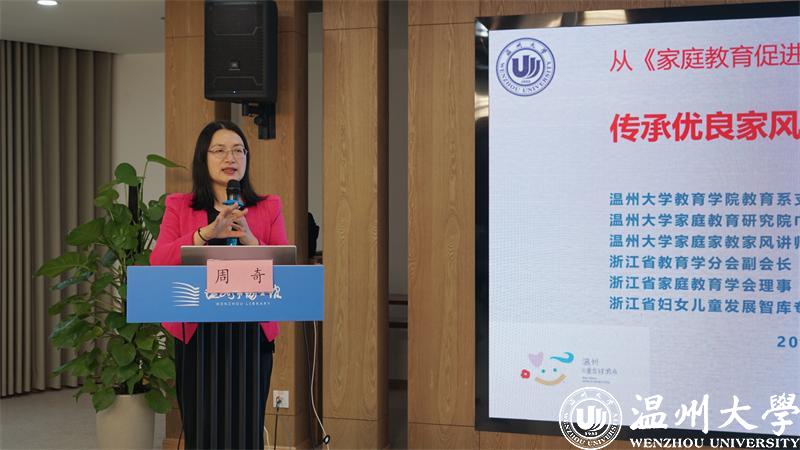 澳门银河官网 教育学院教育学系党支部书记、澳门银河官网 家庭教育研究院巾帼文明岗岗长、全国家庭工作先进个人、浙江省妇女儿童发展智库专家、浙江省家庭教育讲师团成员、家庭教育工作坊负责人周奇老师进行《传承优良家风 培育家国情怀》的主题讲座。
