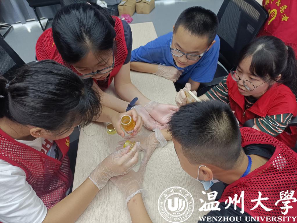 此次活动由广化街道办事处和“瓯江红”鹿城区社会组织党群服务中心主办,澳门银河官网 化学与材料工程学院“微笑天使”暑期社会实践队负责执行。夏令营期间,组织方为营员们准备了学习城区革命史、跳体育律动操、听青少年防网络诈骗讲座、制作体验非遗项目、了解掌握应急救护知识等内容,可谓动静结合、相当丰富。