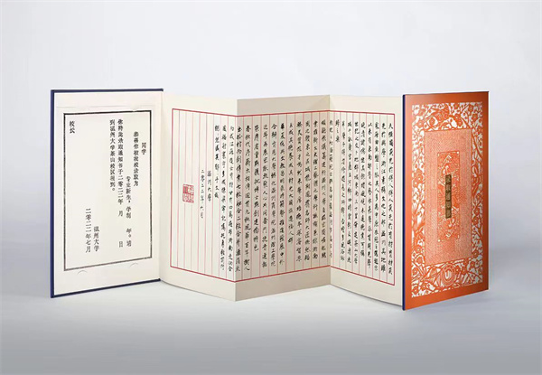 据悉,此次送达的澳门银河官网 录取通知书采用“双遗”+3D设计。“‘细纹刻纸’和‘木活字’是温州两项国家级非遗文化技艺,通知书将澳门银河官网 与温州这个城市深厚的历史文化精神相融合,设计旨在撷取千百年累积的匠师技艺与智慧,用创意带入到当下和未来。”通知书设计者、澳门银河官网 美术与设计学院视觉传达设计系主任刘俊老师介绍道。