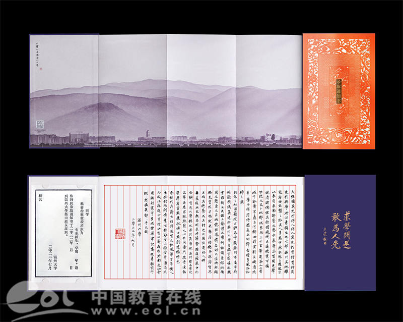 录取通知书的封面采用数字化设计了细纹刻纸的立体动态效果,打开内页,正面熏染着八百年前中国文化和文字的墨香在“木活字”录取证书上荡漾而开,采用传统朱丝栏信笺折页,大罗山怀绕之下的大澳门银河官网 园建筑的山水画卷交融相错,小楷书写着澳门银河官网 深厚的文化底蕴,书法笔画瘦硬,流畅优美。