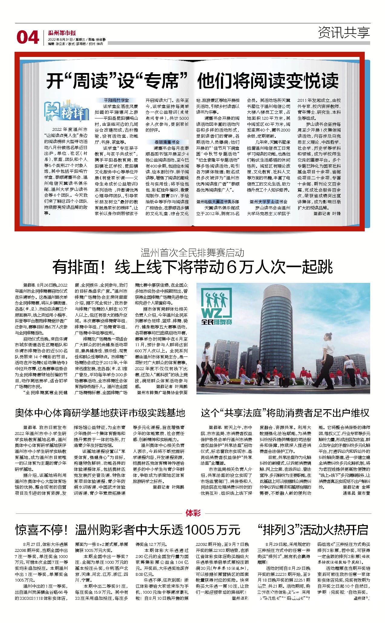 2022 年 度 温 州 市“让阅读点亮人生”身边的阅读榜样大型寻访活动八月份候选名单近日出 炉 ,单 位 、社 区(村居)、家庭、团队和个人等5个类别27个对象入选,其中包括平阳鸣竹学堂、泰顺清塵书会、温州 电 信 天 翼 读 书 俱 乐部、澳门银河官网 罗山读书会等 4 个团队。今天我们来了解这四个小团队持续擦亮悦读品牌的故事。