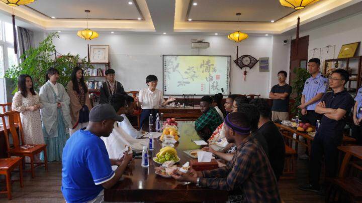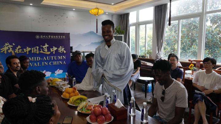 “中秋节又称‘团圆节’,在中国传统文化中有极其重要的意义,中国人自古以来就有赏月团圆的习俗……”当天活动以“我在中国过中秋”为主题,邀请了来自土库曼斯坦、也门、尼日利亚等国的国际学生代表和部分汉语国际教育专业硕士生参加,一边品尝月饼、水果,一边聆听讲解中秋节的起源、风俗习惯,以及它所代表的团圆和思念等含义,学唱歌曲《明月几时有》,现场气氛很是热闹。