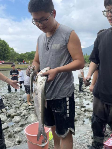 大闸一开,明心湖水缓缓下降,岸边的同学早已穿戴完备,跃跃欲试。随着一声“开鱼咯”,湖面瞬间热闹了起来,草鱼、罗非鱼等纷纷被同学们抓入篓中,岸边的师生也举起手机,记录下这壮观的一幕。