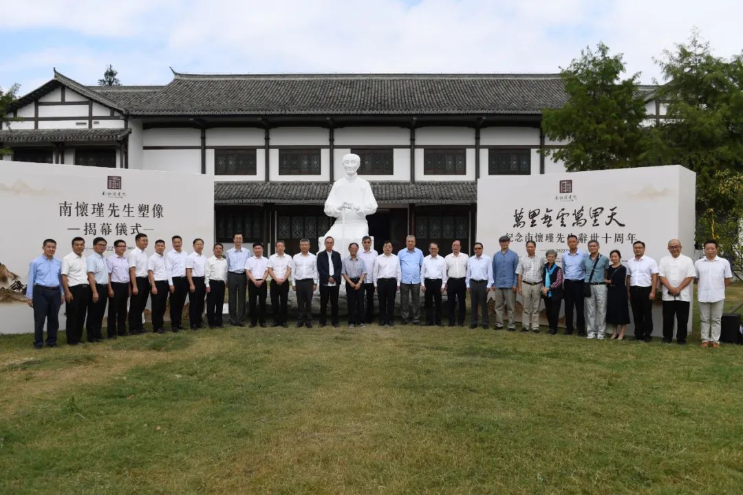 中共中央统战部原副部长、全国工商联原党组书记胡德平,中科院院士、南怀瑾学术研究会会长朱清时,全国政协常委、全国工商联副主席、正泰集团董事长南存辉,中共温州市委常委、统战部长汪驰,温州市政协原主席余梅生,温州市政协副主席徐有平为塑像揭幕。