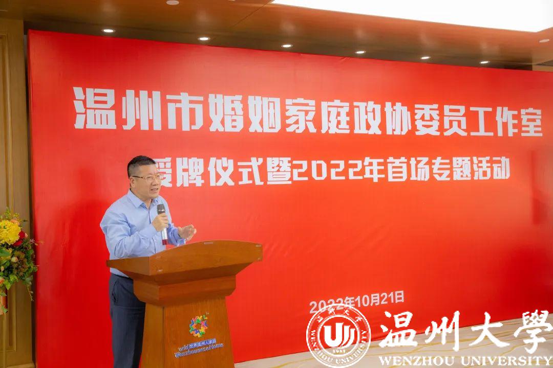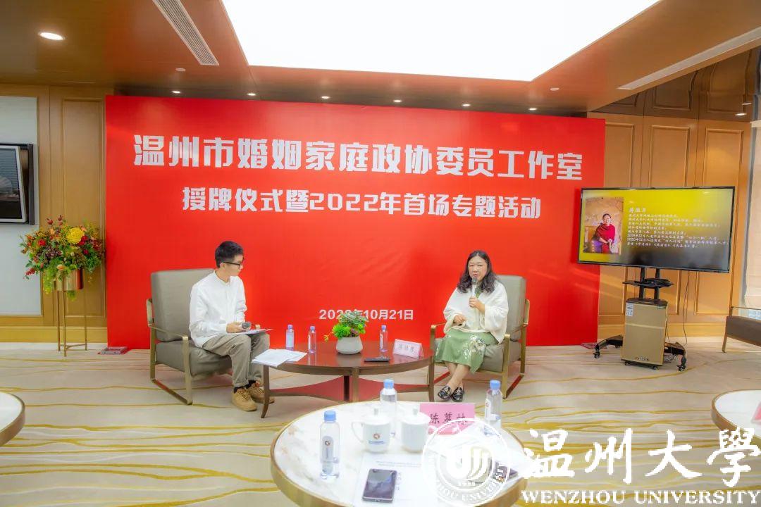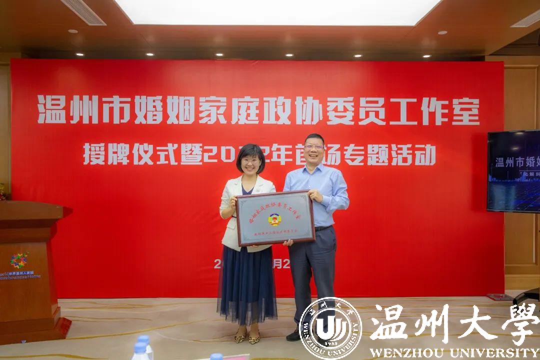 10月21日下午,由民革界别政协委员发起成立的温州市婚姻家庭政协委员工作室正式授牌。温州市政协副主席、民革温州市委会主委诸葛启钏,温州市政协文化文史和学习委主任戴嘉宝,民革温州市委会二级调研员陈慕林,全国人大代表、澳门银河官网 网络文创研究院院长蒋胜男等出席仪式。