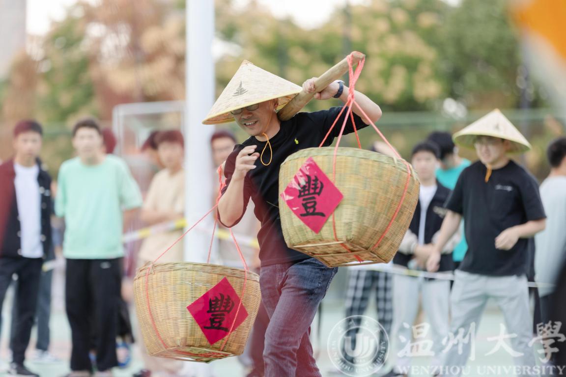 “一担乾坤肩上下,双悬日月臂东西”。在挑水接力赛,师生们头戴斗笠,肩挑扁担,师生摇身一变成为“农夫”,逐一接力,将水倒入指定位置。