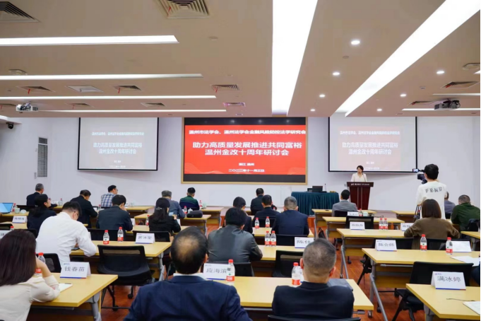 会上,温州市法学会秘书长朱振帼参加会议并致辞,要求会议围绕“反思、慎行、安全”的主题和“助力高质量发展、推进共同富裕”的目标进行充分探讨,为今后温州金改指出新思路、明确新举措、迈上新征程作出贡献。