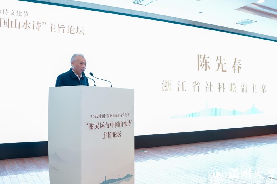 浙江省社科联副主席陈先春也出席了开幕式并讲话,他强调,中国山水诗的正式产生与温州山水有着密切的关系,温州山水留下了谢灵运的足迹,谢灵运在温州的山水诗标志着中国山水诗的正式产生与形成。他表示,本次主旨论坛和学术研讨为温州历史文化研究开辟了新的学术空间,提升了温州城市形象,同时也增强了温州在海内外的文化影响力。