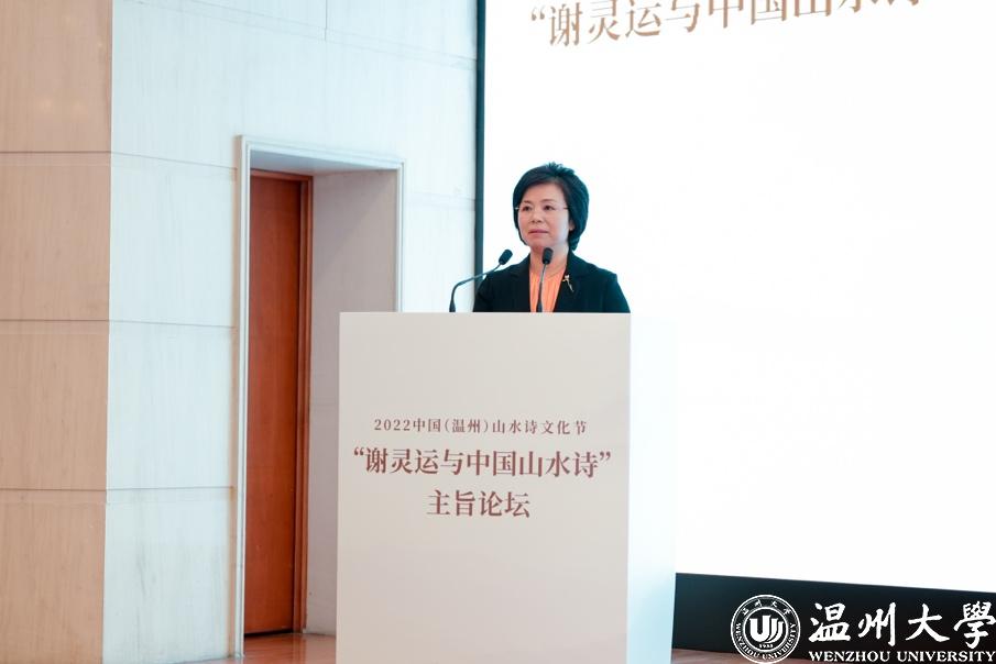 温州市委常委、宣传部长施艾珠首先致辞,向现场和线上参与论坛的各位嘉宾朋友们表示热烈欢迎,并提出“三个希望”:“希望以诗为窗探寻诗化山水,深挖历史文脉,厚实千年商港、幸福温州的文化底蕴;希望以诗彰文,复原‘诗之岛’江心屿、池上楼等名胜古迹,串点连线,打响瓯江山水诗之路的文化品牌;希望以诗润心,极力展示中华文明的精神标识和文化精髓,让留存在瓯越大地上的千年诗篇流动起来。”