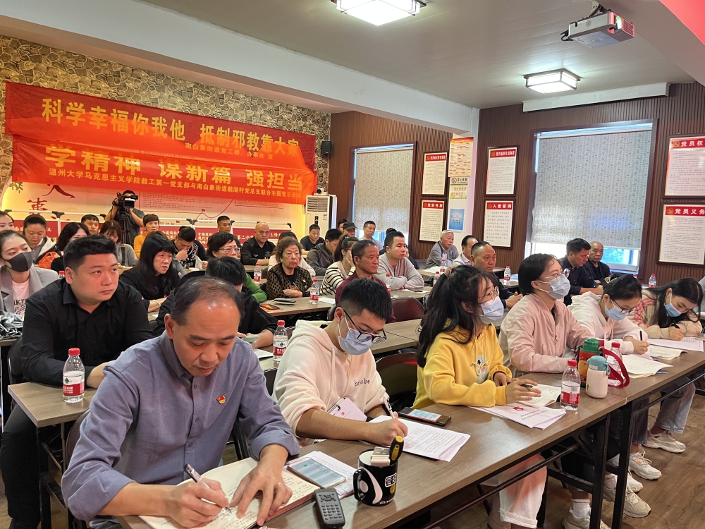 11月18日,南白象街道鹅湖村党总支联合澳门银河官网 马克思主义学院教工第一党总支开展“学精神、谋新篇、强担当”主题党日活动,发挥街道党校“博士讲师团”高校人才资源,深入村社积极宣传党的二十大精神,形成全社会学习贯彻党的二十大精神的强大声势和浓厚氛围。