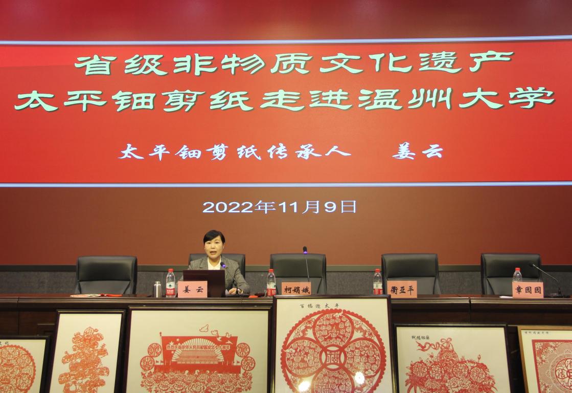 柯娟娥老师向同学们详细讲解了太平钿剪纸的“前世今生”,并分享了自己与剪纸艺术深厚情缘。姜云老师结合部分作品分享剪纸的创作过程和灵感来源,她还强调在传统技艺创作中要不断融入时代元素,并展示了团队创作的建党百年、杭州亚运、冬奥会等主题作品。柯老师团队还带来了代表作品供师生鉴赏。一幅幅太平钿剪纸作品展现在同学们面前,纹样栩栩如生,堪称视觉盛宴。太平钿剪纸赋予了一张纸不平凡的寓意,传递了创作者最真挚的感情。