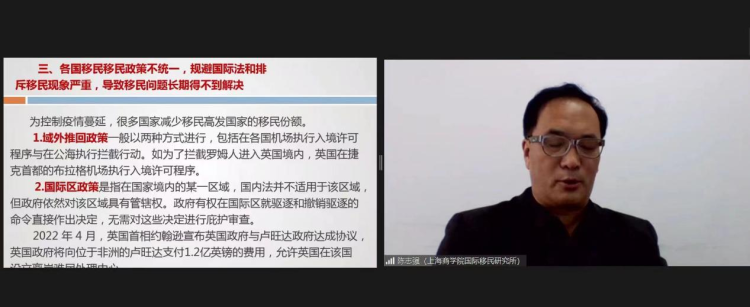 上海商学院国际移民研究所所长陈志强教授做了题为《国际移民新趋势与中国的政策应对》的主题发言。他指出,疫情导致的经济衰退和人员往来的减少,客观上刺激了部分地区的贫困加剧和非法移民、难民数量激增,移民失踪、死亡事件迅速增加,引起国际社会对此现象的关注。此外,各国移民移民政策不统一,规避国际法和排斥移民现象严重,导致移民问题长期得不到解决。