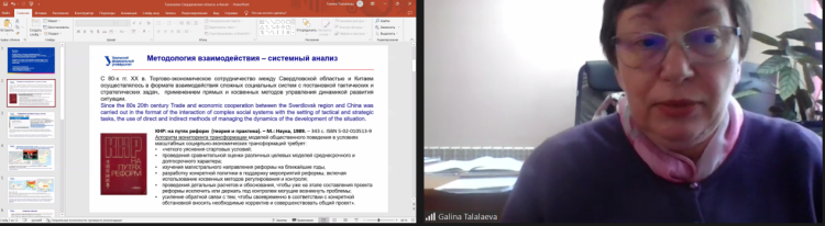 乌拉尔联邦大学社会学和技术学系副教授塔拉拉耶娃G.V.发表了题为《斯维德洛夫斯基州和中国在新的地缘政治环境下的经贸合作安全》的学术报告。