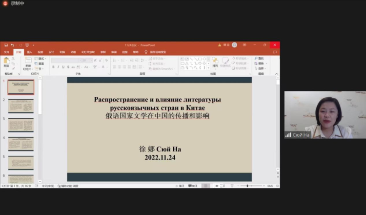 沈阳工程学院国际教育学院教师徐娜做了题为《俄语国家文学在中国的传播和影响》的主题报告。她发现,自19世纪中叶开始,就有俄国文学作品被传教士翻译成中文在中国出版,如《俄人寓言》、普希金的《上位的女儿》等。从译介“俄国文学之父”普希金开始,中国对俄罗斯文学正式接受。此后连续不断有如俄国、白俄罗斯等俄语国家的文学作品被传播到中国。